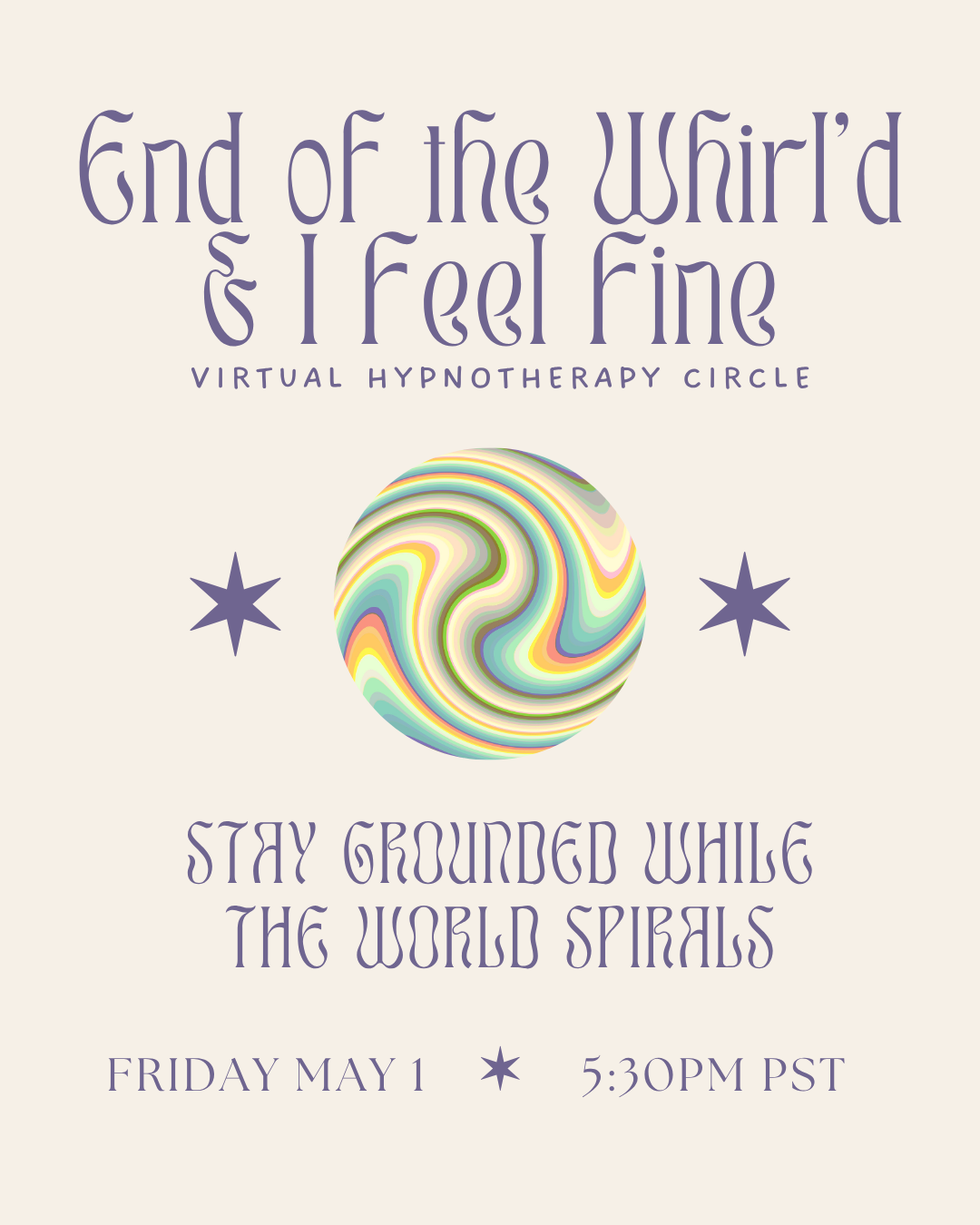 End of the Whirl’d and I’m Feeling Fine is a group hypnosis experience designed to help you release everyday stress and anxiety in a world that feels increasingly overwhelming. Through guided relaxation and gentle suggestion, you’ll build resilience, find your grounding, and strengthen your relationship with your highest self. Get ready to move through change with clarity and ease.